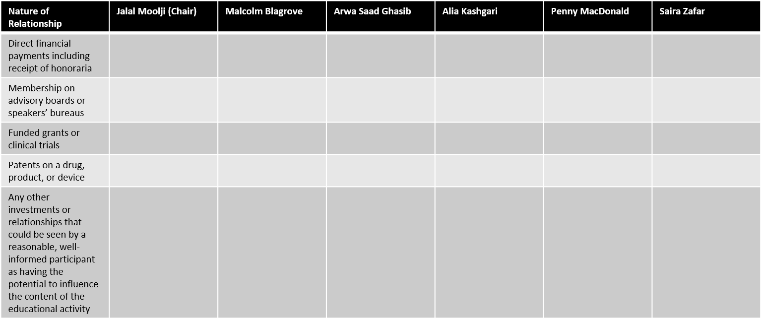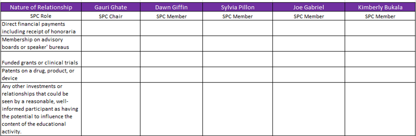 Mitigating Potential Bias: COI disclosure forms have been completed by all SPC members, completed disclosure forms are reviewed by the SPC to ensure no bias exists, and all conflicts of interest are disclosed to learners at the beginning of this course.